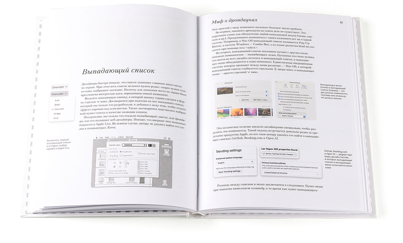 Каждая глава книги посвящена одному компоненту. Книга разбирает кнопки, чекбоксы, текстовые поля, меню, выпадающие списки на уровне анатомии: из чего они состоят, какие состояния имеют и почему одни решения работают, а другие — нет.